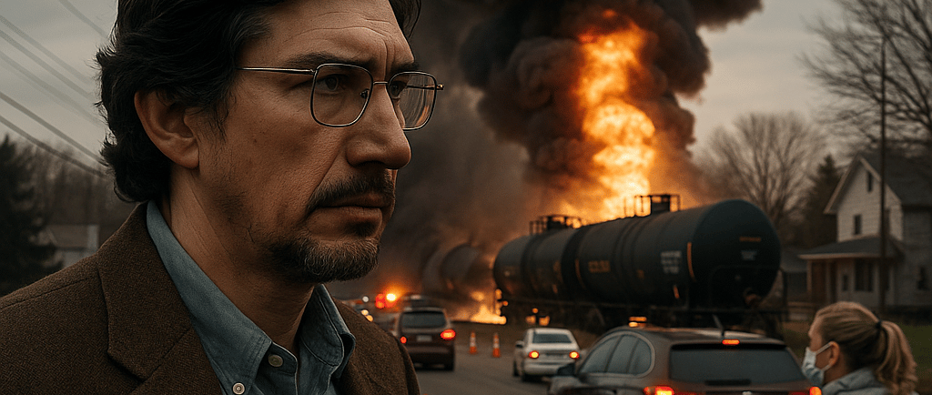 O mais inquietante é que parte do filme “Ruído Branco” foi gravada justamente naquela região. Alguns dos figurantes que aparecem em cenas de evacuação do longa eram, de fato, moradores de East Palestine. Pessoas comuns que, em um momento, interpretaram vítimas de um desastre fictício e, no outro, estavam vivendo exatamente aquilo que tinham encenado diante das câmeras. Um desses figurantes, Ben Ratner, chegou a comentar com a imprensa que se sentia como se estivesse revivendo um pesadelo encenado, algo que ele jamais imaginaria que pudesse acontecer com ele e sua família.